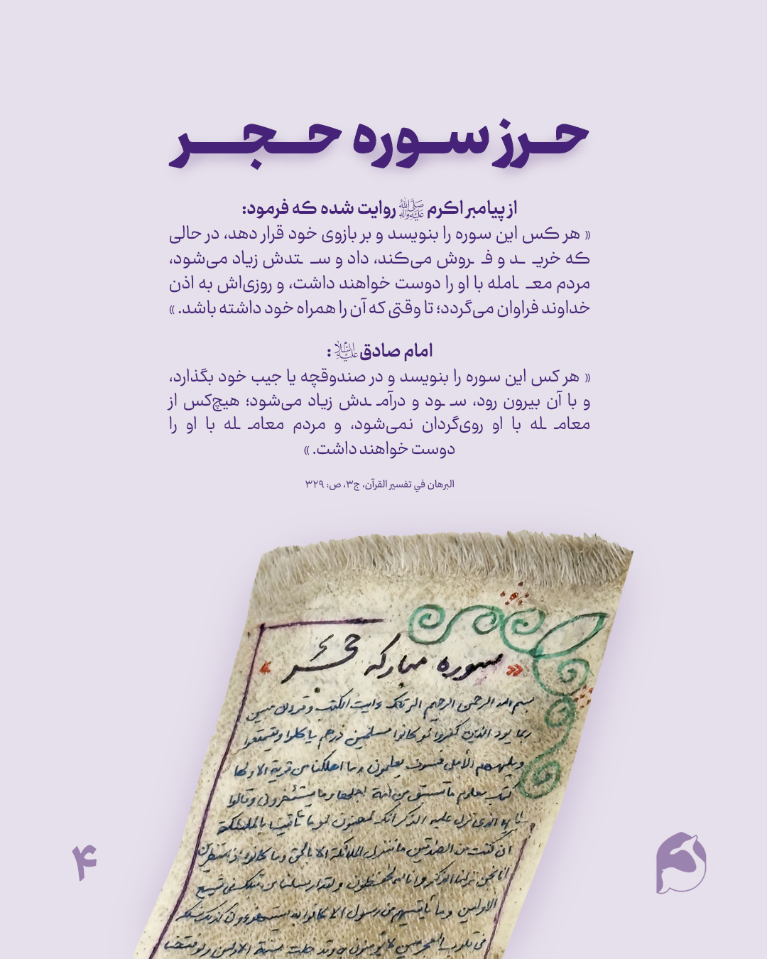 هرکس سوره حجر را در صندوق پول یا جیبش قرار دهد، و صبح به هنگام خروج از منزل همراه داشته باشد،کسب و کارش فراوان میشود و کسی در خرید و فروش با او برابر نمیشود و مردم، معامله با او را دوست دارند.